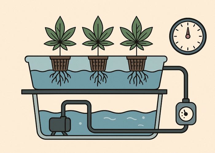 Циклы затопления регулируются таймером и мощностью насоса, позволяя подстраивать полив под текущую стадию развития каннабиса: