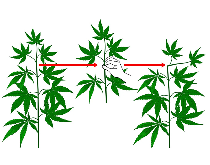 Только для фотопериодных сортов, исключительно в финальной части вегетативного роста, не менее чем за декаду до старта цветения. Основной принцип состоит в предварительном размягчении части стебля, которая будет сгибом в нужном направлении. Главная задача – коррекция неправильной структуры растения.